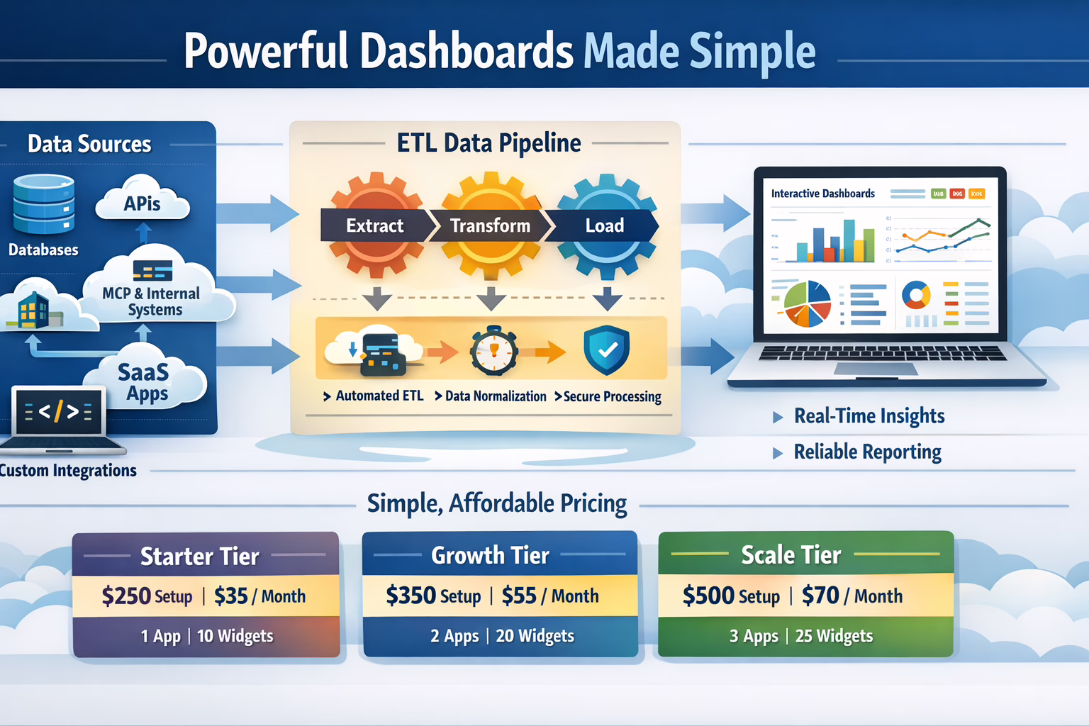 We built a better approach — combining engineered data pipelines with the flexibility of open-source technology like Metabase. The result is a reliable, scalable dashboard platform delivered as an affordable managed service.